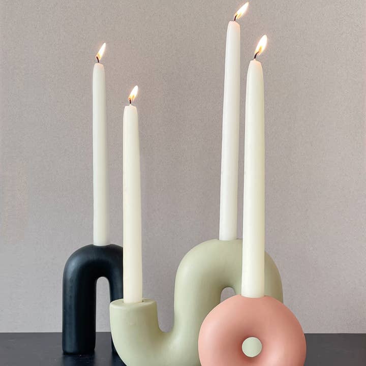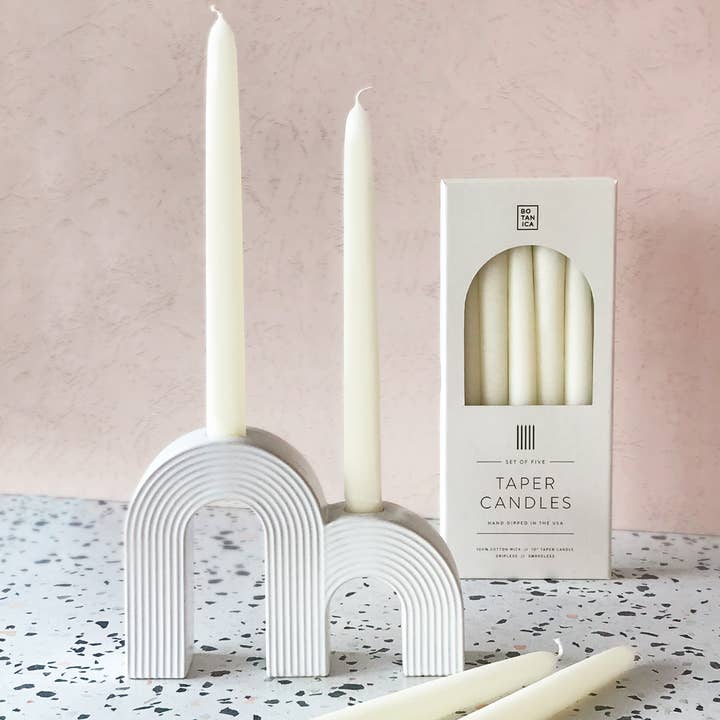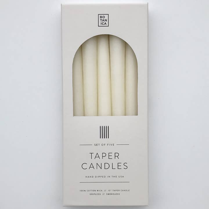 Botanica taper candles are dipped over 20 times by hand, creating the ideal taper–dripless and smokeless–perfect for dinner parties and creating warm, homey ambiance. Our tapers are slightly textured for a handmade finish, and measures a 7/8″ diameter. Each candle is 10″ and burns for approximately 8 hours.