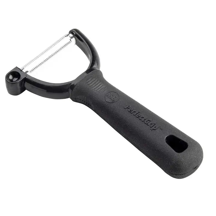 Quickly and efficiently peel fruits and vegetables with this "Y" vegetable peeler. The Y-shaped design allows you to peel in a simple top-to-bottom direction while offering a wider handle over straight-shaped peelers for a better hold. The serrated blades are sharp so that you can make light work of any vegetables with skins or peels.