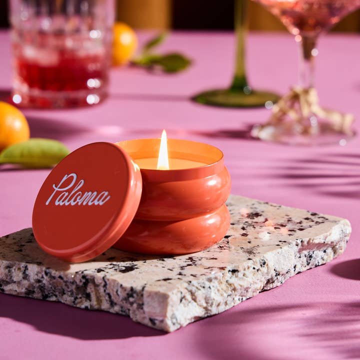 Discover the essence of summertime leisure with our Paloma candle, presented in a peach-hued, brightly colored tin that radiates warmth and joy. This candle infuses your space with the tantalizing aromas of ripe, juicy pink grapefruit and the earthy touch of agave, accented by a sprinkle of salt to enhance the blend's vivacity.