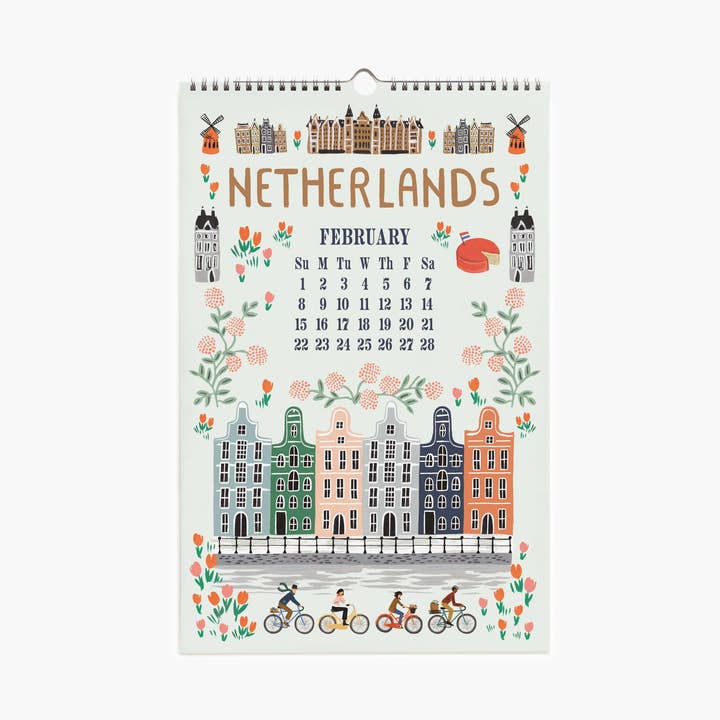 Dreamy destinations to keep you inspired. Our 2026 World Travel calendar includes 12 months of hand-illustrated travel artwork, finished with a spiral binding and center notch for simple hanging.