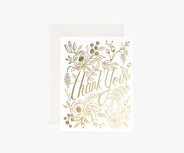 Say thanks in style with this beautiful Rifle Paper Co Marion Thank You Card! Featuring a delicate gold design, this card will add a touch of class to any thank you message. Show your gratitude with a pinch of panache!