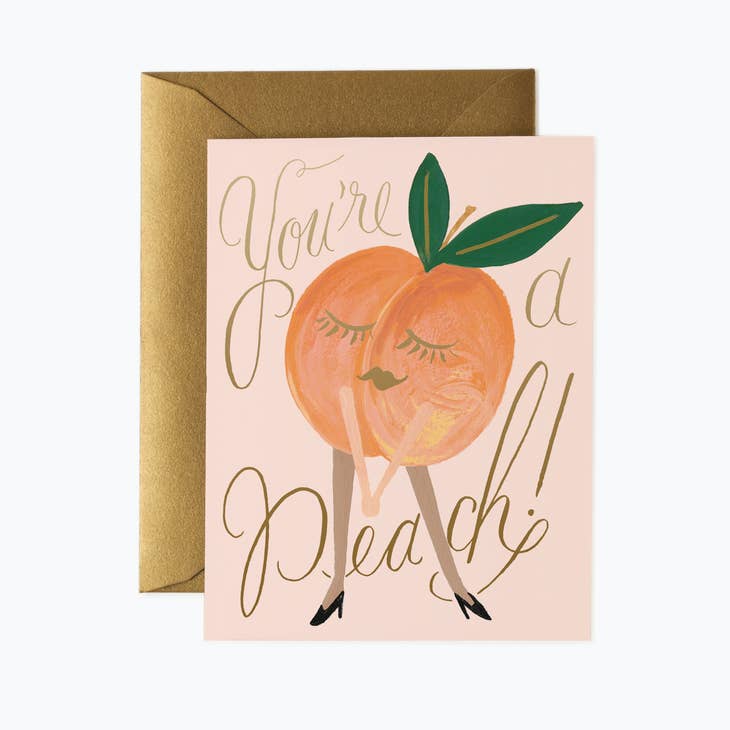 Send your best wishes with this Rifle Paper Co card! Sure to make your recipient smile from ear to ear, this unique card features gold detailing and the phrase "you're a peach". Show them how much you care with this oh-so-sweet sentiment!