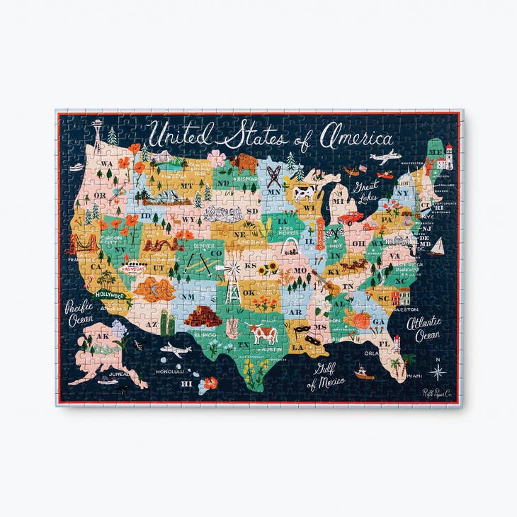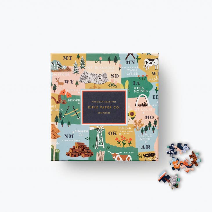 Inspire your next open road adventure with our American Road Trip jigsaw puzzle, featuring iconic landmarks from sea to shining sea. Our illustrated puzzles include 500 pieces, packaged in a decorative box with gold foil accents.